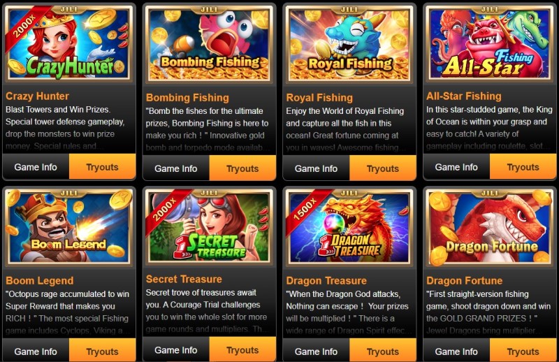 Sảnh game bắn cá Jili có một kho game bắn cá ấn tượng với 11 trò chơi. Mỗi trò chơi đều có sự độc đáo riêng, thu hút người chơi trực tuyến bằng thiết kế hình ảnh cổ điển và các nhân vật quen thuộc như cá mập, bạch tuộc, khủng long và rồng thần.